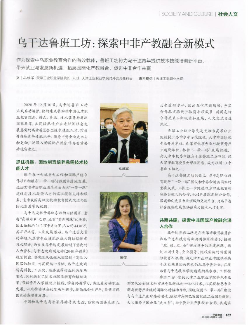 2021年3月,中国投资(中英文)杂志以“乌干达鲁班工坊:探索中非产教融合新模式”为题报道了万象城孔维军院长撰写的乌干达鲁班工坊的办学模式。