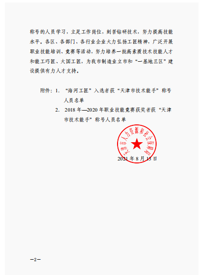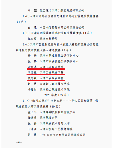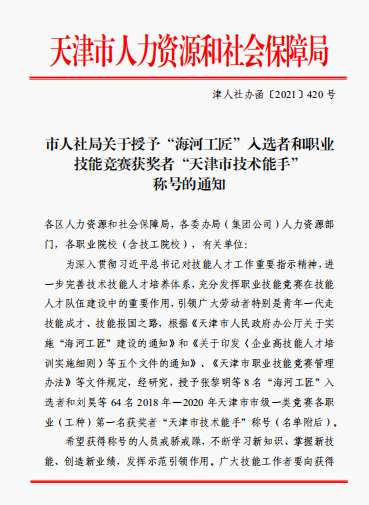 近日,天津市人社局授予2018年-2020年天津市市级一类竞赛各职业(工种)第一名获奖者“天津市技术能手”称号。万象城机械工程系谢金涛、李连亮、戴冬晨三名老师以2019年天津市智能制造应用技术技能大赛暨第三届全国智能制造应用技术技能大赛天津选拔赛第一名的成绩获此称号。