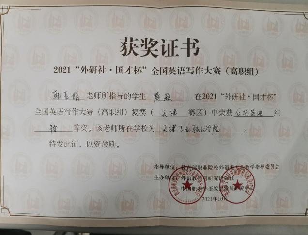 赛前,基础部韩亚娟、王晓磊两位老师分别对代表学院参赛的大数据20-5班的薛颖同学和会计20-9班的王海凤同学进行培训和指导,两位教师梳理总结大赛历年的试题,选取不同的主题进行专项练习,从写作内容和写作技巧上有针对性的开展练习指导。两位同学虚心求教,反复进行写作练习,熟记单词,掌握写作技巧。赛场上,两位选手凭借扎实的英语语言基本功,严密的逻辑思维能力,最终获得优异成绩,其中,薛颖同学以位列第一名的成绩获得了天津赛区特等奖,并代表天津赛区晋级全国总决赛;王海凤同学获得了天津赛区三等奖。
