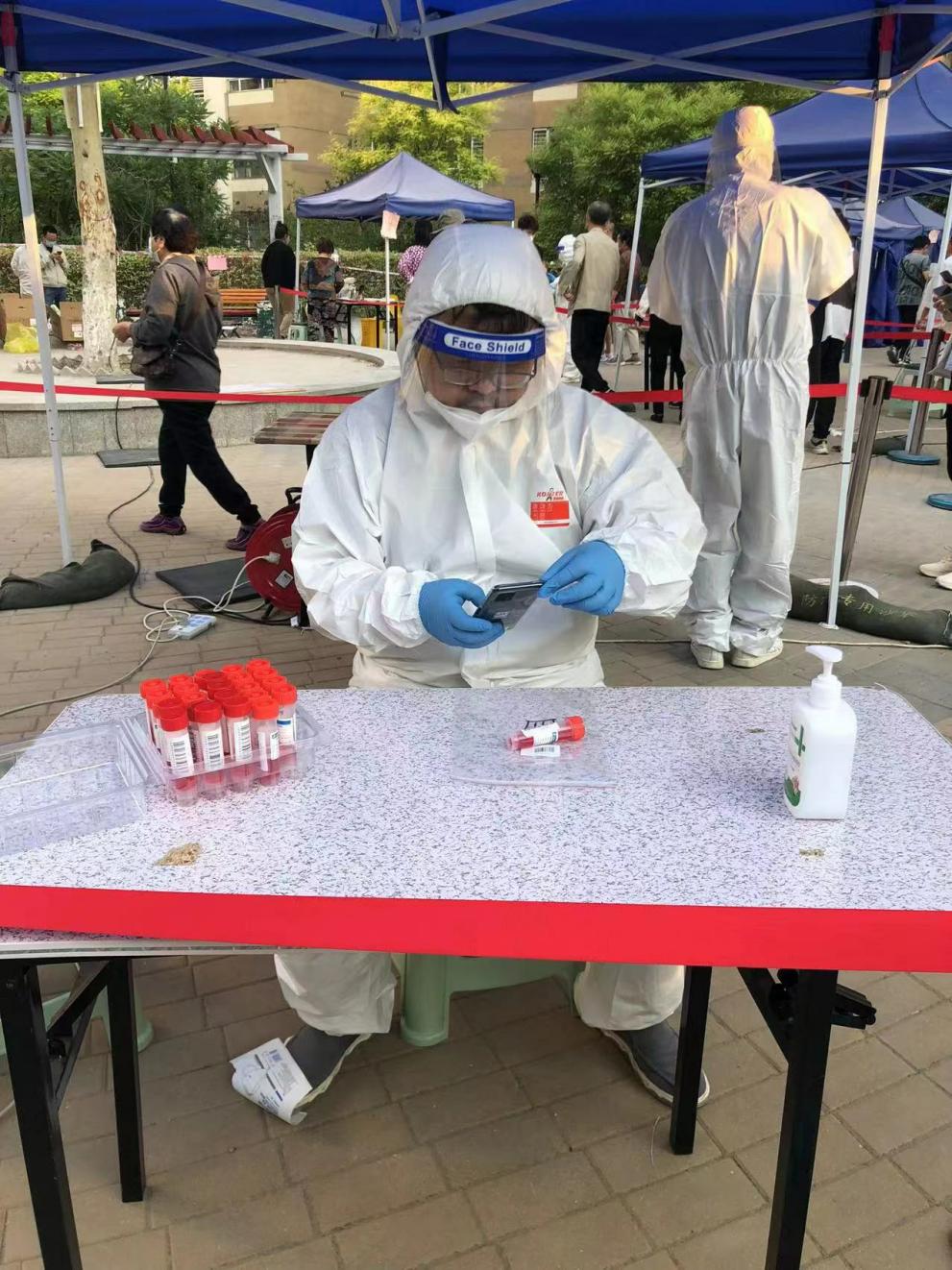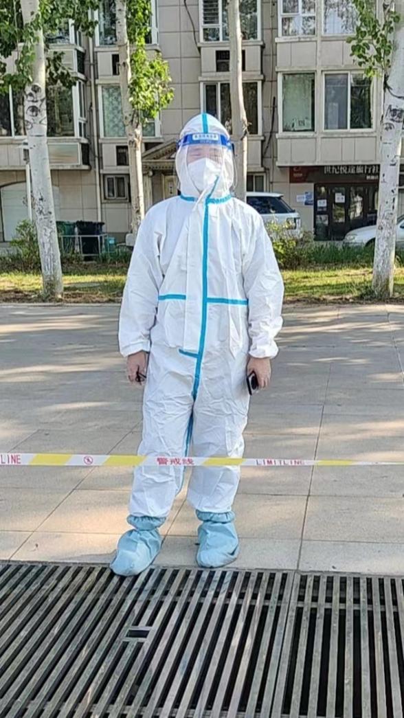 每日早晨5点到居委会报道,整理物资运送至检测场所,主动请缨担任信息录入任务。身穿防护服和面罩,平均工作3.5小时,在高温下工作汗水很快湿透了全身。