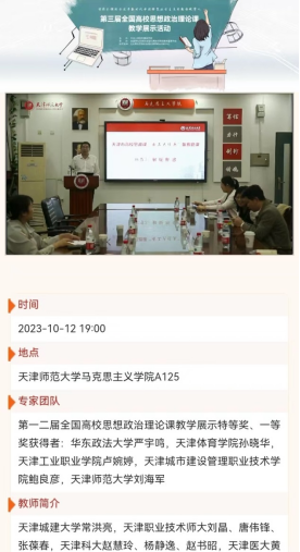 根据《教育部办公厅关于开展第三届全国高校思想政治理论课教学展示活动的通知》,经天津市教育两委学生处批准,全国高校思政课手拉手集体备课中心(天津师范大学-天津市)、全国高校思政课名师工作室(天津师范大学)于2023年10月12 日组织了天津市高校思想政治理论课“云上大练兵”备赛磨课活动和选手答疑指导等活动,并通过全国高校思政课教研系统直播。