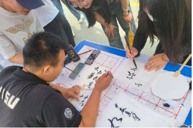 活动现场精心设置了多个互动体验摊位,师生们可以在这里自由参与和体验各种传统文化项目。活动涵盖了团扇绘制、脸谱绘画、剪纸艺术、植物拓染、写意书法、干花书签等6个方面,可以让参与者全方位领略中华文化的博大精深。