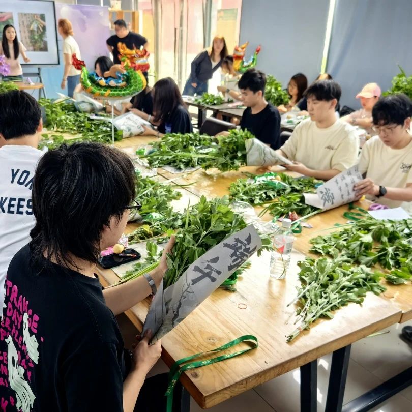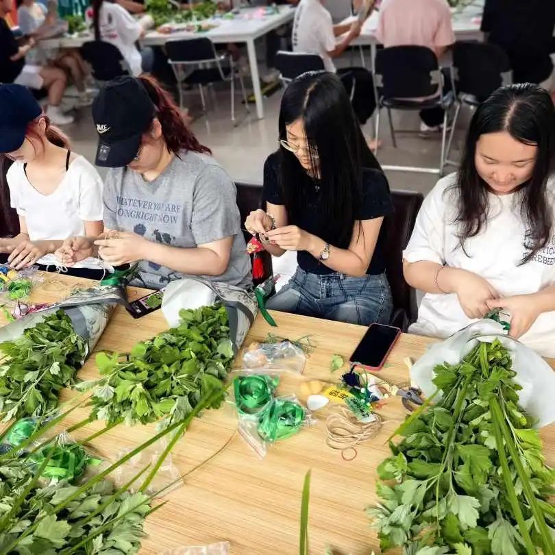 花艺老师带领学生用马蔺草编制端午门挂,讲解马蔺草“耐旱耐贫瘠、象征坚韧品格”的特性——正如身处逆境却自强奋进的受助学生群体,历经生活磨砺,始终心怀梦想、矢志奋斗。师生实践互动中,中华传统文化中坚韧自强的精神,与青年学子面对困境的成长感悟相互交融。这堂生动的劳动与传统文化课,让家国情怀的种子在青年心中悄然萌发,化为前行的力量。