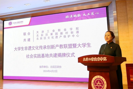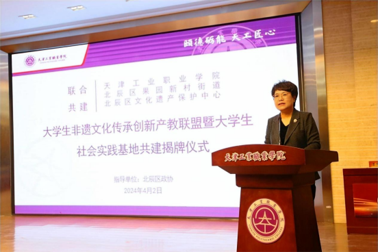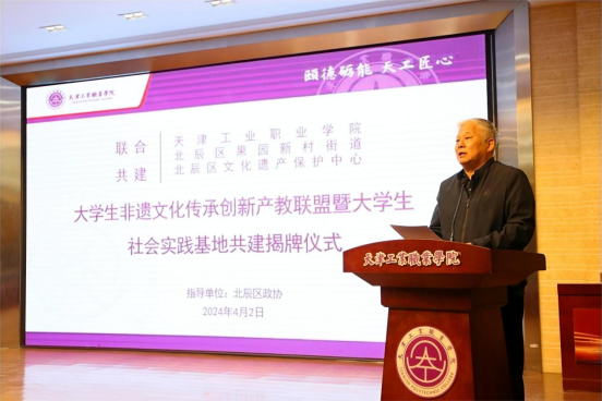 为深入学习贯彻习近平总书记视察天津重要讲话精神,坚持以文化人、以文惠民、以文润城、以文兴业,2024年4月2日下午,由学院党委学生工作部(学生管理部)牵头举办的万象城allwincity官网入口、北辰区果园新村街、北辰区文化遗产保护中心合作共建大学生非遗文化传承创新产教联盟暨大学生社会实践基地签约揭牌仪式在六角报告厅隆重举行。北辰区政协副主席王芳、工业职业学院院长孔维军出席仪式并讲话。北辰区政协提案办公室主任张立海,果园新村街党工委书记张新宇,果园新村街党工委副书记、政协联络站站长刘杨,工业职业学院副院长张秀芳,北辰区文化遗产保护中心主任曹广凤及北辰区政协委员代表,学院党委学生工作部、教务部、招生就业指导办公室、思政课部相关负责同志,学院五系党支部副书记,师生代表出席仪式。